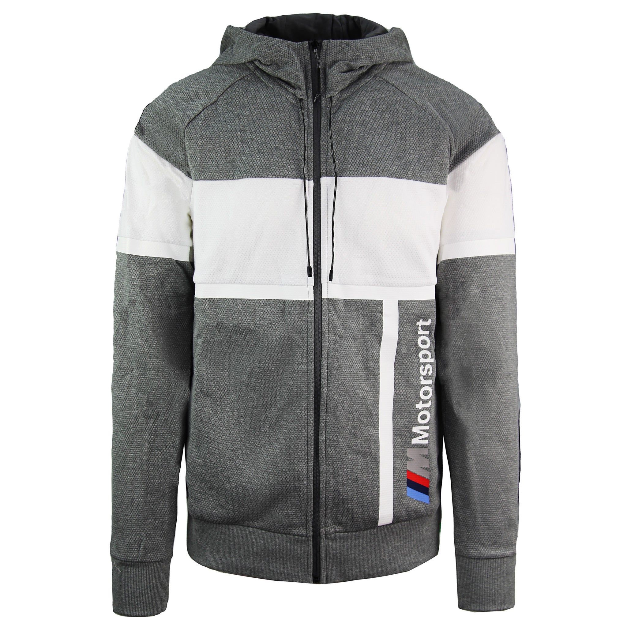 The modern block design features contrasting grey and white panels, adding a dynamic, sporty touch. The iconic BMW Motorsport branding, including the tri-color "M" logo and "Motorsport" text, runs vertically on the front, emphasizing its racing heritage. The adjustable hood with drawstrings and full-zip closure ensures practicality and versatility, allowing for easy layering and a snug fit.