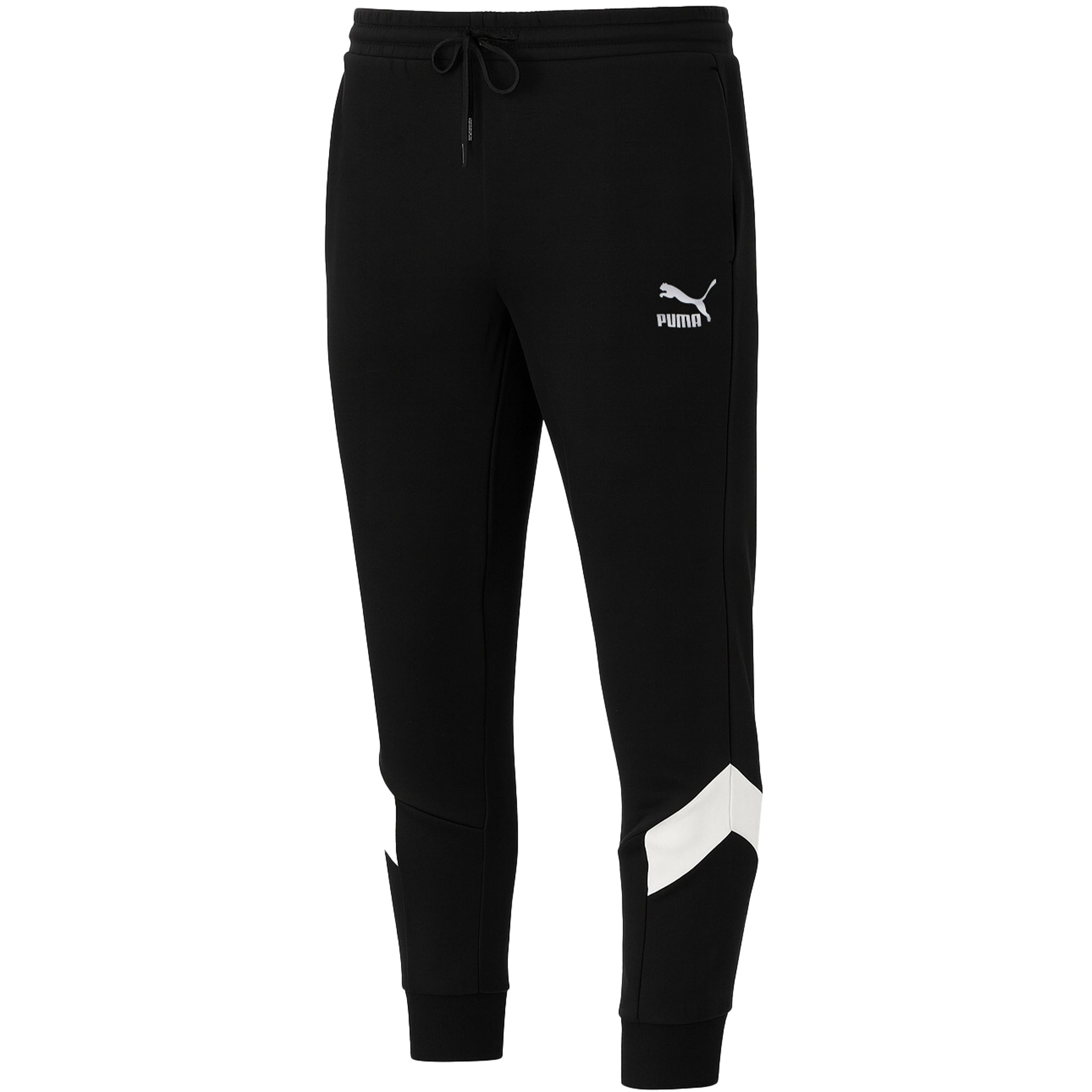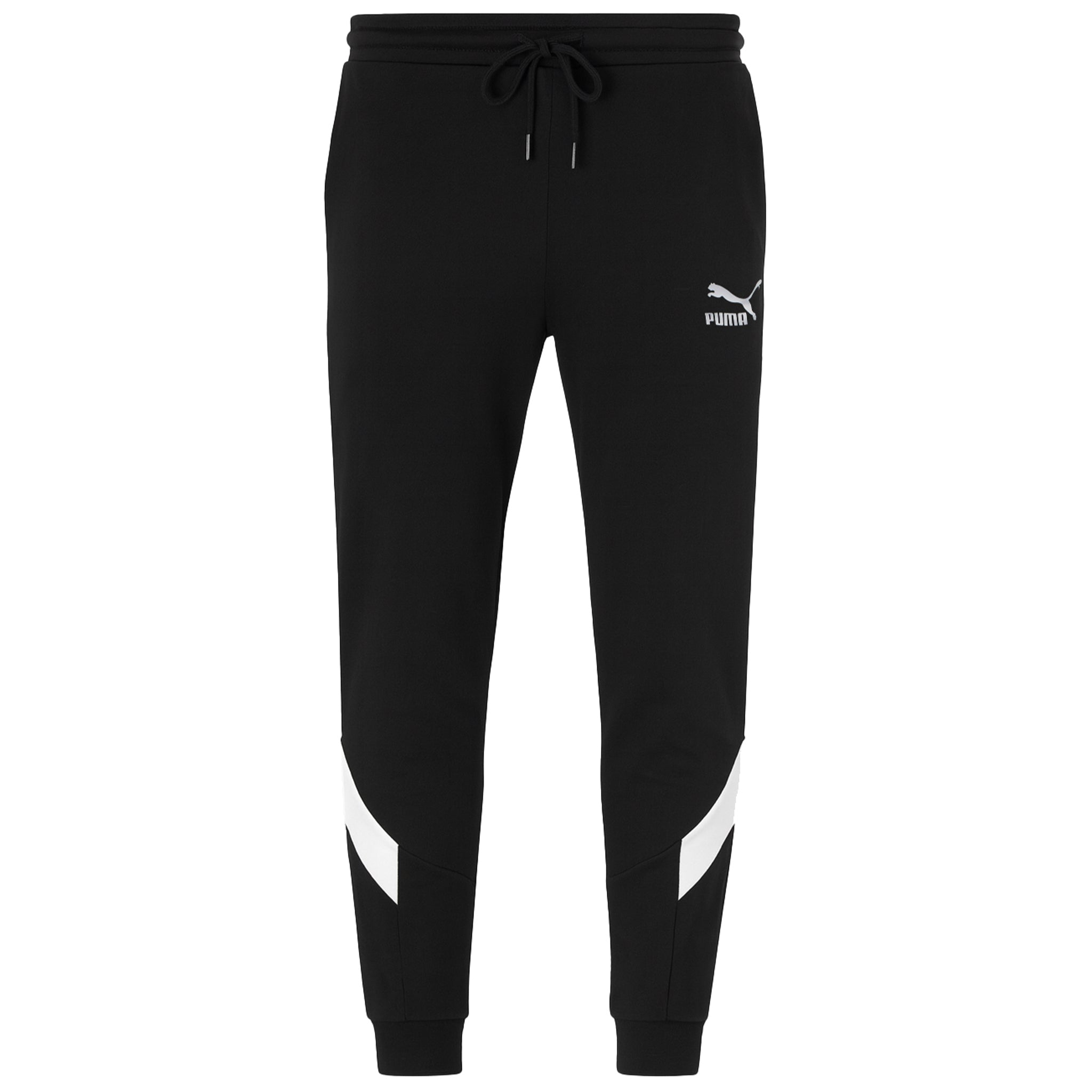 The Puma Men's Iconic MCS Track Pants are a stylish and comfortable choice for both athletic and casual wear. Crafted from soft, durable fabric, these black joggers feature a classic MCS design with a modern twist. The white accent stripes on the sides add a touch of contrast, giving the pants a sleek and dynamic look. The elastic waistband with an adjustable drawstring ensures a secure and customizable fit, while the ribbed cuffs at the ankles provide a tapered silhouette. With the Puma logo displayed on the front, these track pants are perfect for hitting the gym, lounging, or sporting a streetwear look.