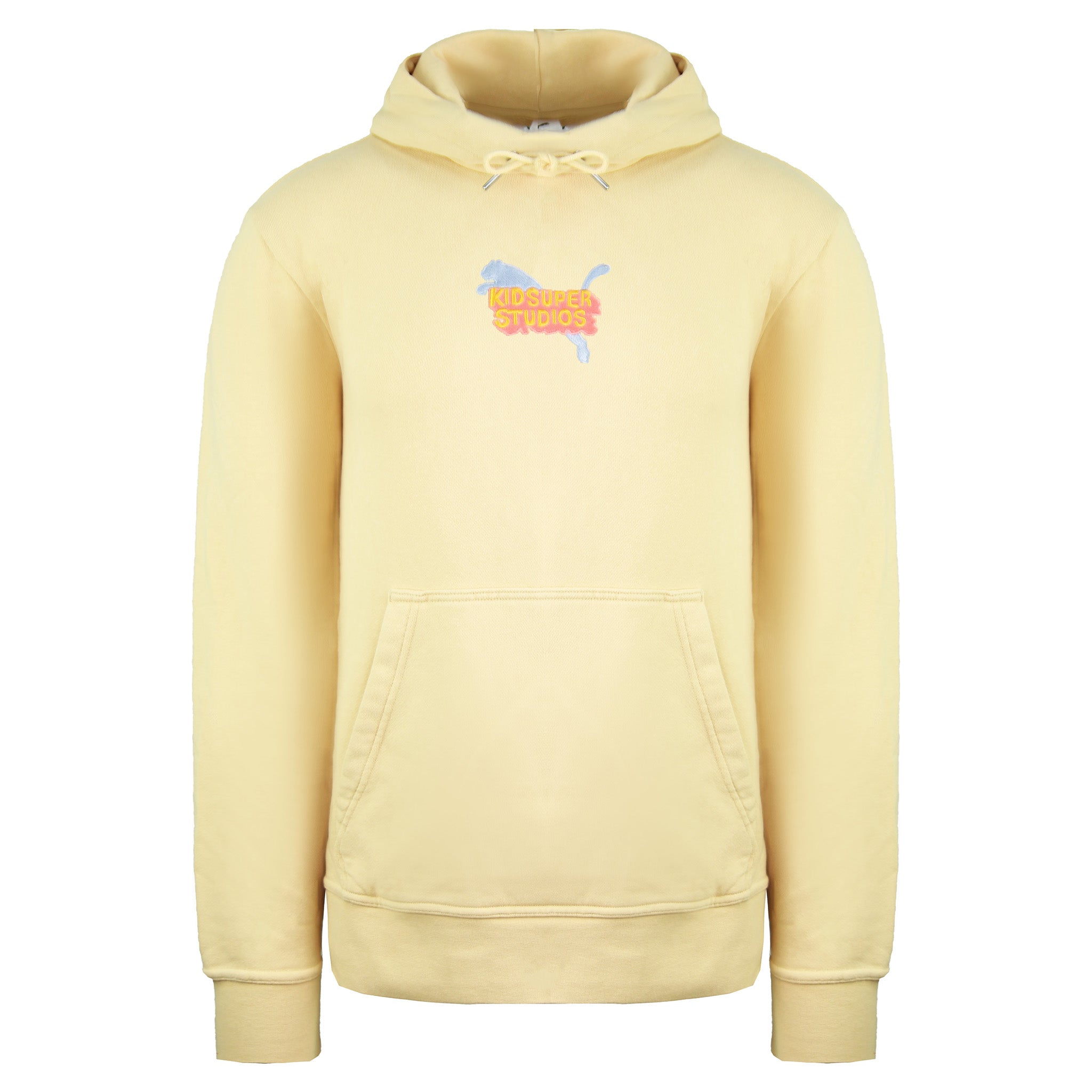 The Puma x KidSuper Studios Long Sleeve Honey Peach Men's Graphic Hoodie is a vibrant and stylish piece perfect for casual wear. This hoodie features a soft, honey peach color and is adorned with a bold KidSuper Studios graphic logo on the chest, adding an artistic and playful touch. It includes an adjustable drawstring hood, a front kangaroo pocket, and ribbed cuffs and hem for a comfortable fit. Ideal for relaxed, everyday wear, this hoodie combines modern design with a cozy, streetwear-inspired look.